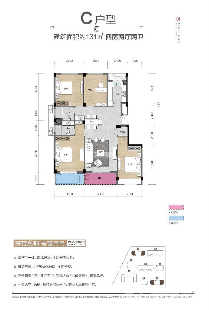 C户型4室2厅2卫 建筑面积131平米